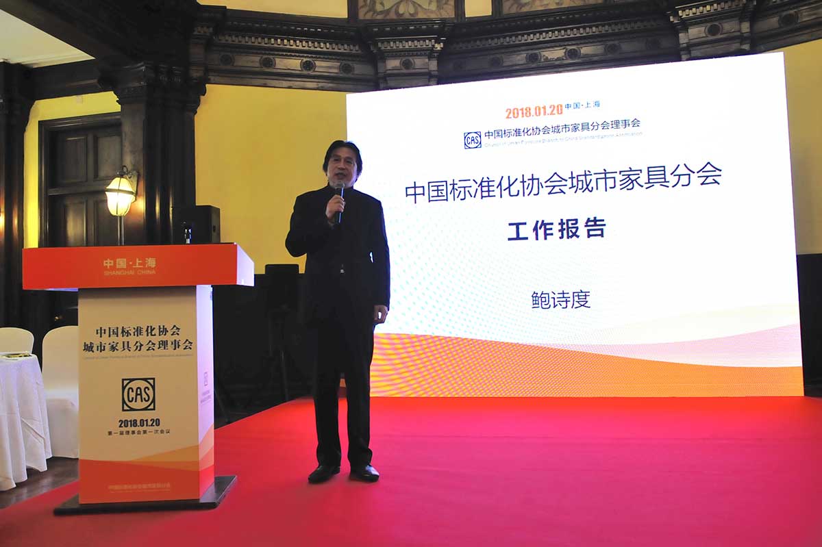 ▲中国标准化协会城市家具分会会长鲍诗度做分会工作报告